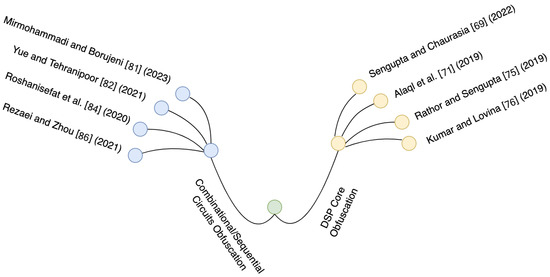 - Combinational/Sequential Hardware Obfuscation: This type of obfuscation involves making changes to the gate-level configuration within the circuit itself [62,63].