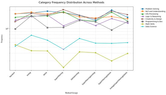 Category frequency distribution across eight data selection methods. The line plots reveal substantial variance in category preservation rates, particularly for Math Skills. This indicates that different selection strategies systematically favor distinct semantic categories, with SuperFiltering exhibiting the strongest category-specific bias.