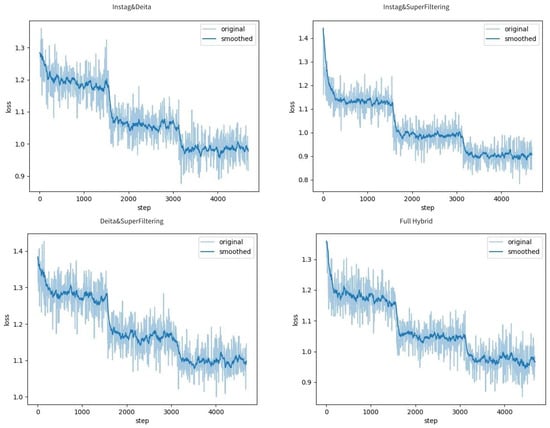 All integrated selection strategies fail to outperform individual methods, highlighting that naive combination of multiple selection criteria introduces conflicting optimization signals and compounded learning difficulty. As illustrated in Figure 3, hybrid methods consistently exhibit higher final losses and flatter descent curves, with the Deita and SuperFiltering combination reaching the highest terminal loss (1.1), indicating that merged selection logic preserves data complexity and hampers convergence.