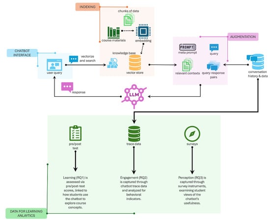 Framework of the RAG-based chatbot used in the study. The chatbot processes user queries by retrieving relevant chunks of course material from a vectorized knowledge base, augmenting the input with contextual information, and generating a response using an LLM. Additionally, interaction data feed into learning analytics to examine student engagement (RQ2), learning outcomes via pre/post-tests (RQ1), and student perceptions through surveys (RQ3).