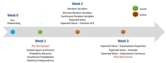Timeline and topics across a three-week experimental study. Ten multiple-choice questions with compatible difficulty levels were delivered during the pre-test and post-test sessions. Figure reproduced from [13] under a Creative Commons License, (CC BY 4.0).