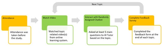 Overview of the study procedure for each topic, illustrating the structured sequence of activities supported by the learning management system and chatbot. The figure highlights how instructional content and chatbot interactions were integrated to guide and support student learning throughout the study.