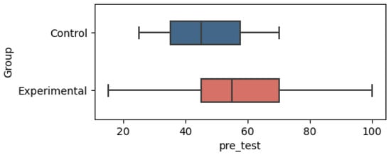 Among the 45 students who completed the study, 11 were assigned to the control group and 34 to the experimental group. Figure 4 presents a boxplot of the pre-test scores for both groups. An independent samples t-test revealed no statistically significant difference in pre-test performance between the control group (, ) and the experimental group (, ), with a p-value of 0.4037 (). Although the difference was not statistically significant, the visual distribution of scores showed a rightward shift in the experimental group, suggesting slightly higher baseline performance that warranted closer examination.