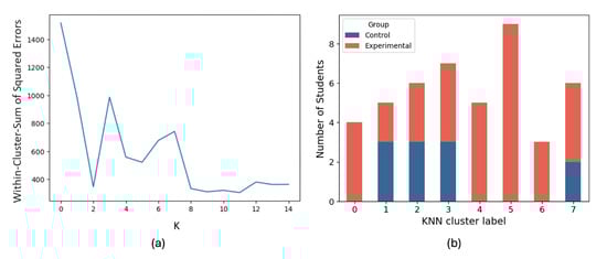 (a) Elbow plot showing the within-cluster sum of squared errors (WCSS) for K-means clustering across different values of K. The “elbow” at suggests an optimal number of clusters where the WCSS sharply decreases before plateauing. (b) Bar plot illustrating the distribution of students across K-means cluster labels, grouped by experimental condition (Control vs. Experimental). Clusters with labels 1, 2, 3, and 7 contain students from both groups.
