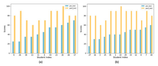 Pre- and post-test scores of students after applying K-means clustering-based resampling, shown separately for (a) the control group and (b) the experimental group. The plots illustrate how score distributions differ within each group before and after the intervention.