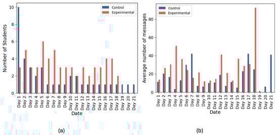 Student–chatbot interaction trends over the course of the experimental study. (a) Daily count of unique students who interacted with the chatbot. (b) Average number of messages sent to the chatbot per student each day. These metrics provide insight into student engagement levels and usage patterns throughout the study period.