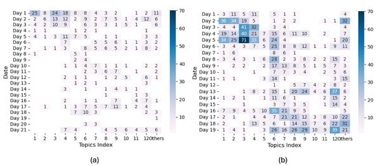 Number of chatbot messages sent by students in the (a) control group and (b) experimental group, broken down by topic and tracked daily. This visualization highlights differences in chatbot usage patterns and topical focus between the two groups over time.