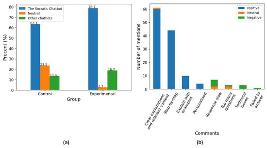 Student feedback on chatbot usage. (a) Chatbot preference by group, showing the percentage of students who preferred the Socratic chatbot, expressed neutral opinions, or preferred other chatbots. The experimental group showed a stronger preference for the Socratic chatbot. (b) Categorized student comments about the chatbot, coded by sentiment (positive, neutral, or negative). Most comments were positive, highlighting clear explanations and step-by-step guidance, while a smaller number noted issues such as slow responses or technical problems.