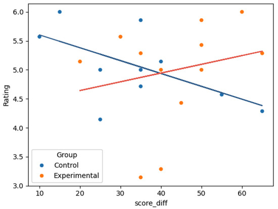 In addition, an exploratory analysis was conducted to examine the potential relationship between performance improvement and student perceptions, using a scatter plot to compare the control and experimental groups (see Figure 10). The variable represented learning gains, calculated as the difference between pre-test and post-test scores, while captured students’ average self-reported satisfaction or perceived instructional quality on a scale of 1–6, 6 being most satisfied. Although the results were not statistically significant, visual inspection suggested differing patterns across the two groups. In the control group, a weak negative trend () is observed, wherein higher learning gains were loosely associated with lower satisfaction ratings. This may imply that traditional instruction, while potentially effective in promoting cognitive development, could also be perceived as more demanding or stressful by students. In contrast, the experimental group exhibited a weak positive trend (), suggesting that students who gained more from the intervention tended to report higher satisfaction. While these observations do not yield conclusive evidence, they demonstrate the potential utility of such analyses for investigating the interplay between cognitive and affective outcomes. These preliminary patterns align with the broader aims of the proposed framework, which emphasizes the dual importance of academic achievement and learner perceptions in evaluating educational interventions. Further research with larger samples and more robust designs is needed to clarify the nature and significance of these relationships, particularly in digital and hybrid learning contexts.