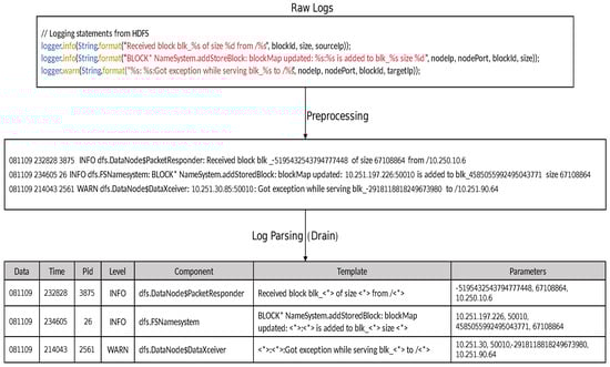 An example of an HDFS log and the corresponding log template event generated using the Drain log parsing method, where the variables in the log are replaced by placeholders <*> according to the template order.