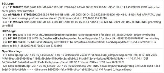 - Zhu, J.; He, S.; He, P.; Liu, J.; Lyu, M.R. Loghub: A large collection of system log datasets for ai-driven log analytics. In Proceedings of the 2023 IEEE 34th International Symposium on Software Reliability Engineering (ISSRE), Florence, Italy, 9–12 October 2023; IEEE: Piscataway, NJ, USA, 2023; pp. 355–366. [Google Scholar]