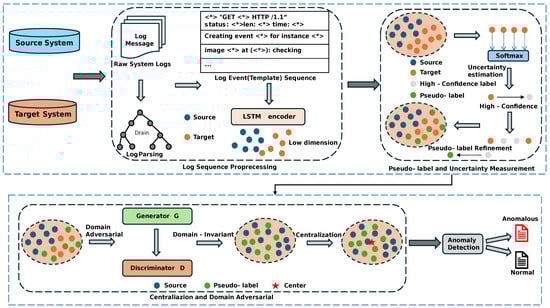 This paper presents ELFA-Log, a cross-system log anomaly detection framework that addresses the challenges of distributional differences and insufficient labeled data in the target domain. By enhancing pseudo-labeling [33] with uncertainty measurement techniques [34], the framework improves generalization. It maps log sequences from both systems to a shared feature space, where pseudo-labeling generates high-confidence labels and uncertainty measurement filters out low-confidence predictions. Anomalies are detected based on the distance from the learned center in the low-dimensional space, with sequences farther from the center flagged as anomalies. Figure 3 illustrates the framework, which comprises four key components: log sequence processing, pseudo-labeling with uncertainty measurement, centralization and domain adversarial learning, and anomaly detection. Together, these components enable effective cross-system log anomaly detection by addressing data distribution shifts and minimizing the dependency on labeled data.