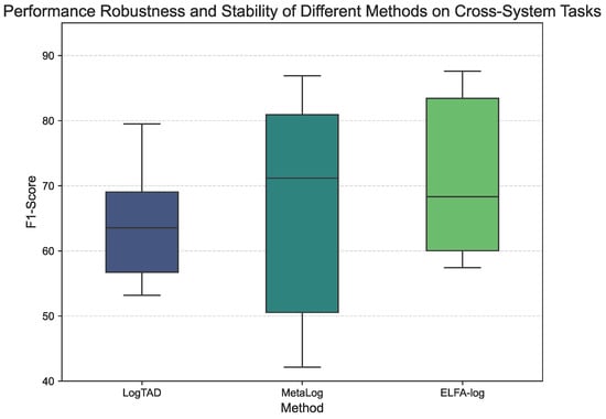 To further visualize the performance distribution and stability of each method, Figure 4 presents a box plot of the F1-scores for each method to show their performance distribution across the six tasks. The median F1-score of ELFA-Log is higher than that of MetaLog and LogTAD. ELFA-Log demonstrates more consistent performance across tasks, as indicated by the shorter box in its plot compared to MetaLog.