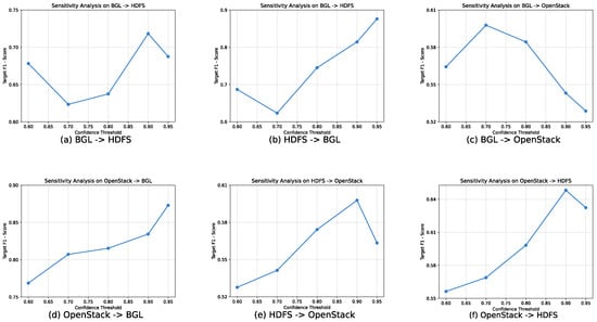 The selection of an appropriate pseudo-label confidence threshold is a crucial step in striking a balance between the quality and quantity of self-generated labels. A detailed sensitivity analysis was performed for this hyperparameter across all six cross-system tasks to validate the choices made for our main experiments. The findings, presented in Figure 5, illustrate the model’s F1-score as a function of the threshold. The analysis reveals that the optimal threshold is highly dependent on the intrinsic characteristics of the target domain.