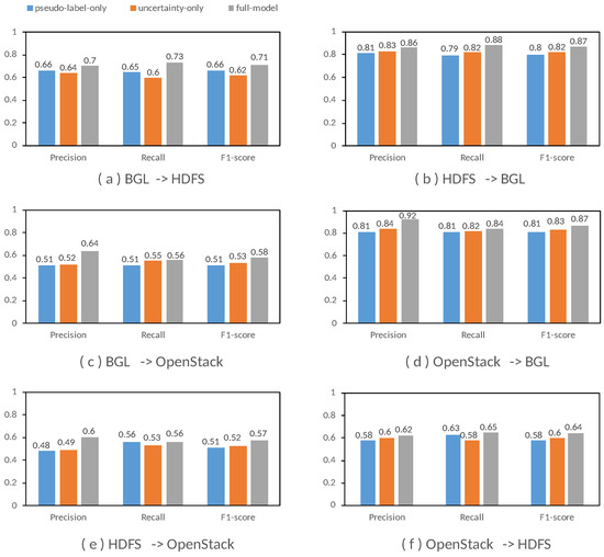 Figure 6 presents the Precision, Recall, and F1-Score of three model variants across six cross-system scenarios. In each case, the performance of the full model was compared to that of variants where either the pseudo-labeling mechanism or the uncertainty measurement method was omitted. The ablation experiments reveal that both components contribute to the model’s ability to generalize and its detection performance, though the extent of their impact varies across scenarios.