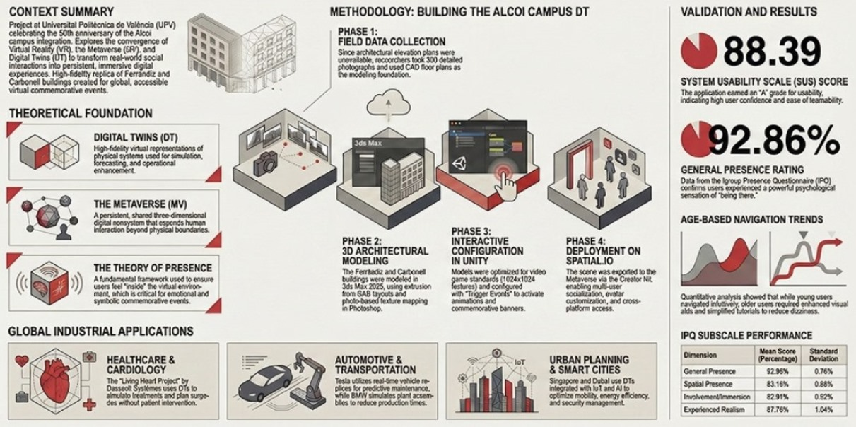 To commemorate the 50th anniversary of the integration of the University School of Industrial Technical Engineering into the UPV, a comprehensive design effort has been carried out. For this experiment, first, a DT was designed of the Alcoi campus of the UPV. Next, and based on several photographs, the Ferrándiz and Carbonell buildings that make up the central part of the campus were modeled in 3D using 3ds Max 2025. The brand image was then created by designing the logo. A series of canvases with a commemorative image have been modeled in 3D, which are displayed on the facades of the Ferrándiz and Carbonell buildings, like a stage, as they are still installed in the urban space. With the Unity game engine, user interactions with the scene have been configured, such as the activation of animations, videos, etc., and they have been implemented in the template of the same program on the Spatial.io web portal, enabling the development of a digital twin in the MV. Spatial is a free application that provides a socialization interface, where we can customize our avatar and chat or voice with other users. In conclusion, the convergence of VR, MV, DT, and the creation of virtual events is causing a paradigm shift, especially in the way we interact with the digital world. Its impact will continue to expand in the coming years, revealing new opportunities for innovation and global connectivity. This article is structured as follows. First, the proposed digital twin is developed in