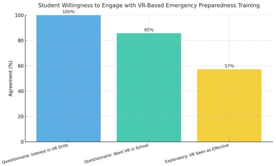 Figure 2. Comparison of student answers regarding their willingness to use VR for emergency preparedness training across the questionnaire study and the exploratory evaluations.