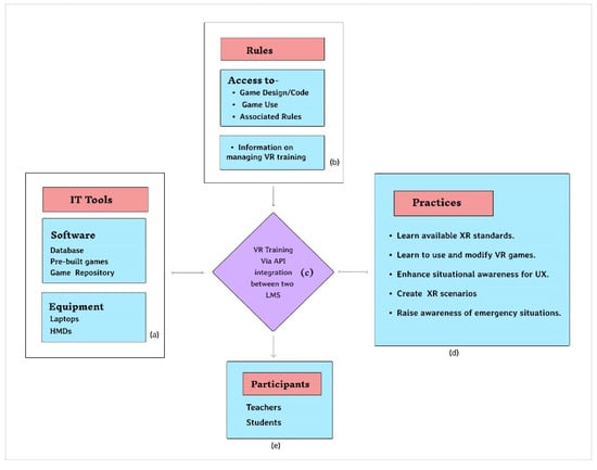 Figure 3. The Inclusive Virtual Reality for Knowledge Transfer (IVR-KT) framework, enhancing the focus areas one needs to focus on for implementing VR in education (adopted from [14]). (a) IT Tools: Necessary software and hardware (e.g., databases, HMDs). (b) Rules: Access to design/code, usage guidelines, and VR policies. (c) Integration: Central VR training integrated via API between two LMSs. (d) Practices: Learning standards, creating XR scenarios, and improving UX. (e) Participants: Involvement of students and teachers in the training process.
