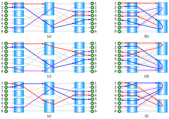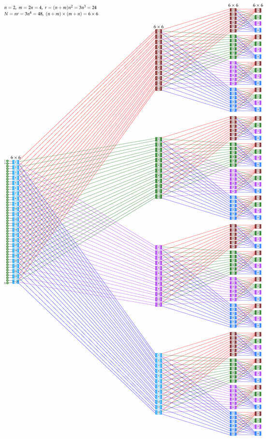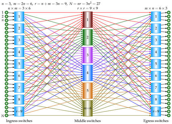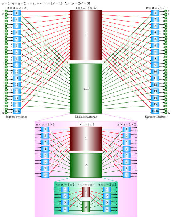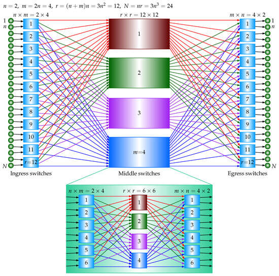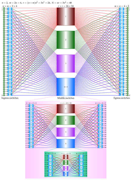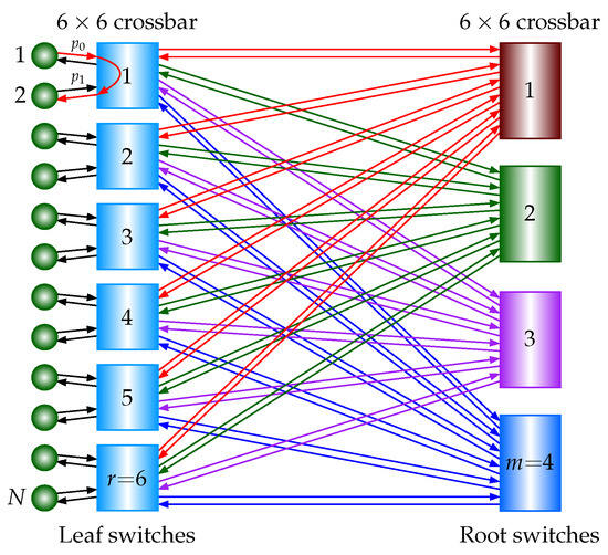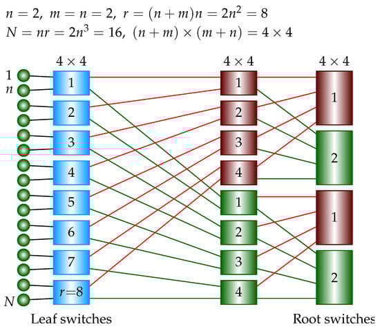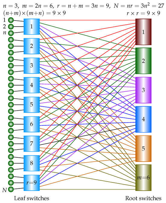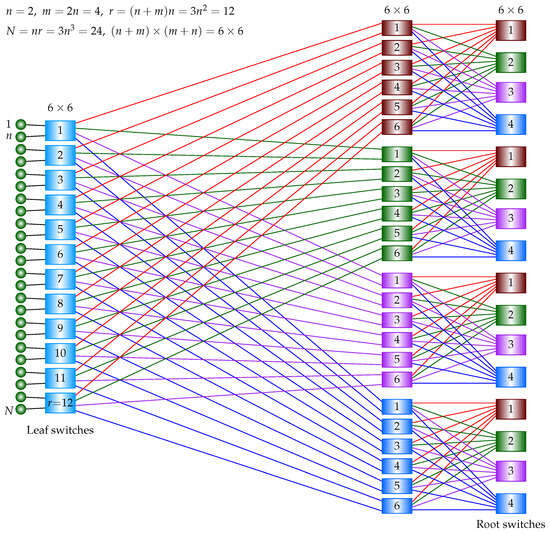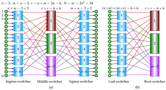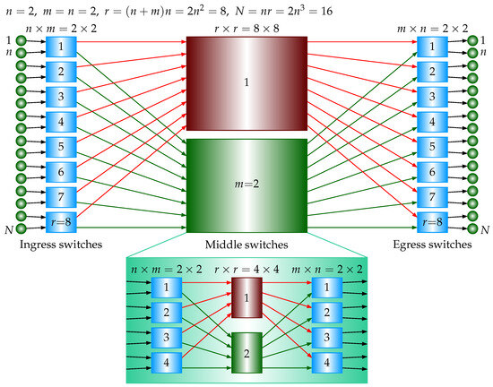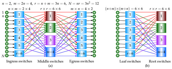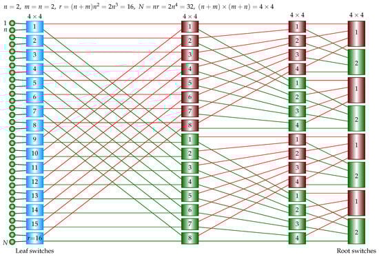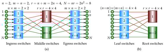 - Clos, C. A study of non-blocking switching networks. Bell Syst. Tech. J. 1953, 32, 406–424. [Google Scholar] [CrossRef]