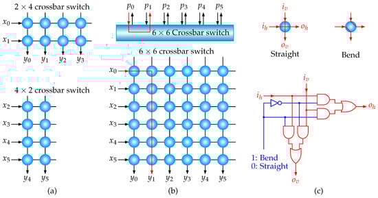 Referring to Figure 2, for and , Figure 2a shows an crossbar and an crossbar. The number of crosspoints is . There are no paths from inputs and to outputs and . Similarly, there are no paths from inputs , , , and to outputs , , , and . Figure 2b shows an crossbar. The number of crosspoints is . Any input () can be routed to any output () for . A crosspoint can be implemented using two two-to-one multiplexers, as shown in Figure 2c.