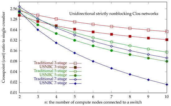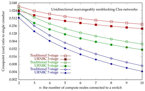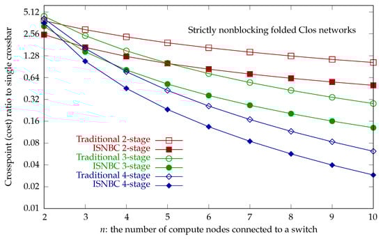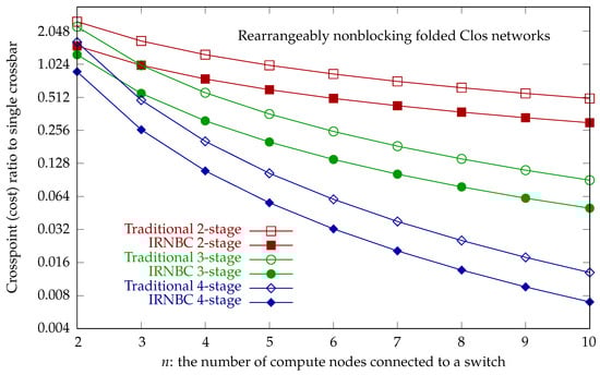 Table 15 summarizes the crosspoint ratio relative to a single crossbar for traditional rearrangeably nonblocking folded Clos networks and IRNBC networks. The cost ratios for the proposed IRNBC networks relative to traditional networks are , , and for three-stage, five-stage, and seven-stage networks, respectively. The general formula for calculating the IRNBC crosspoint ratio relative to a single crossbar is , where s is the number of stages and the number of compute nodes is .