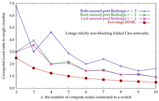 The number of crosspoints for traditional rearrangeably nonblocking folded Clos networks with is examined below. In a two-stage traditional rearrangeably nonblocking folded Clos network, the total number of crosspoints is . There are compute nodes. A single crossbar requires crosspoints. The crosspoint ratio of a two-stage traditional rearrangeably nonblocking folded Clos network relative to a single crossbar is .