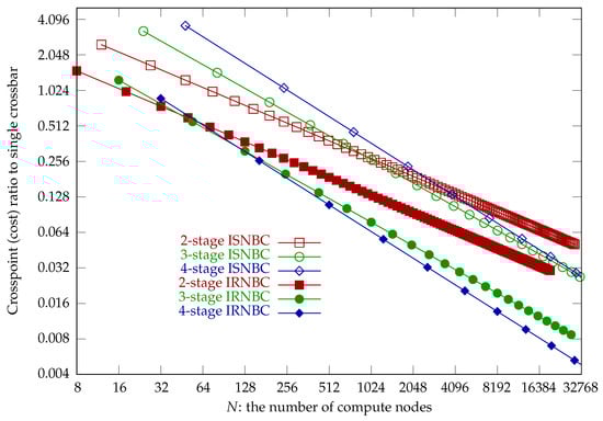 Referring to Figure 16, in a four-stage IRNBC network, the total number of crosspoints is , where is the number of crosspoints in a three-stage IRNBC network, as derived above. There are compute nodes. A single crossbar requires crosspoints. The crosspoint ratio of a four-stage IRNBC network relative to a single crossbar is .