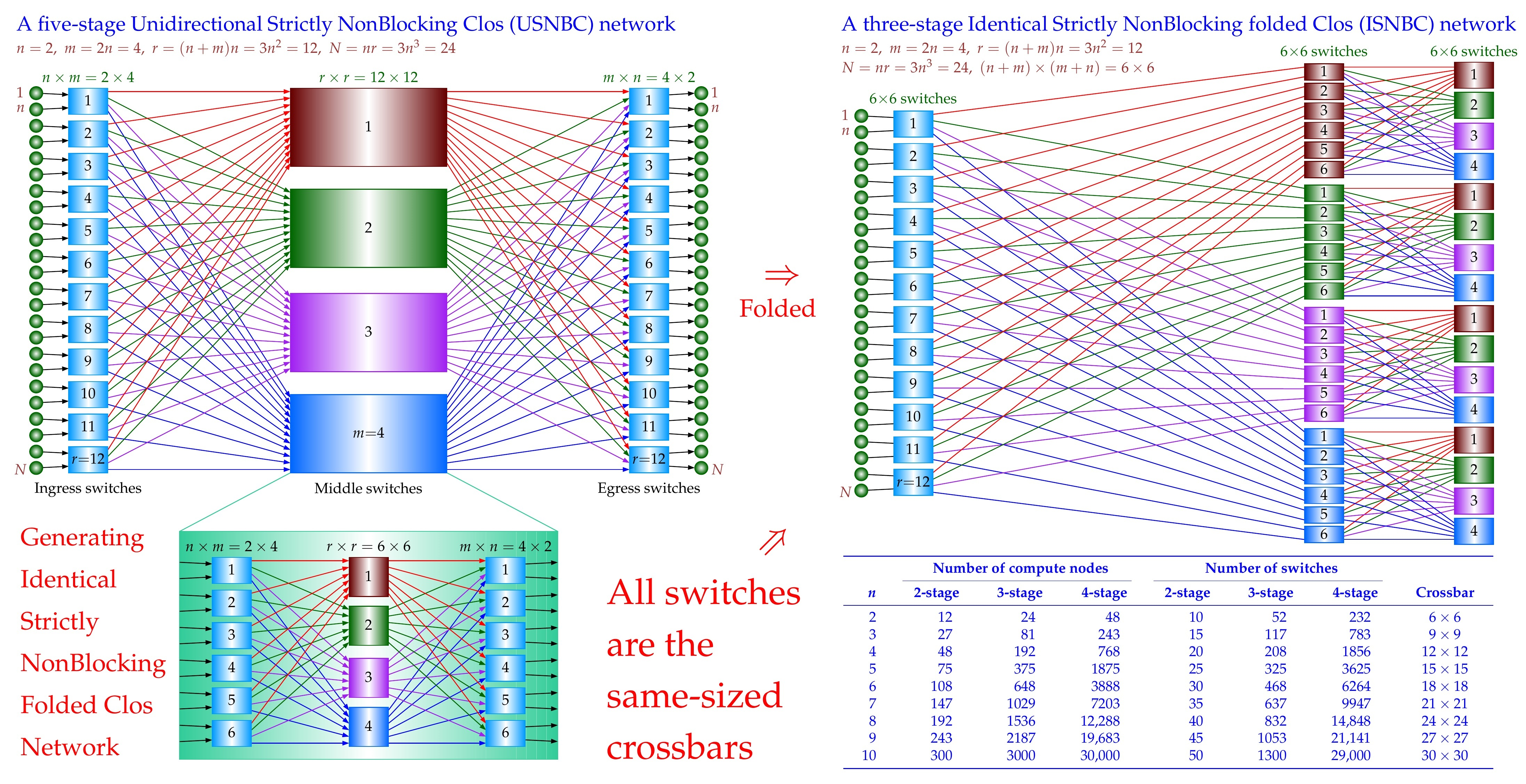 The number of crosspoints for a traditional strictly nonblocking folded Clos network that uses crossbars of different sizes is examined below. A two-stage traditional strictly nonblocking folded Clos network has n switches in the leaf stage and switches in the root stage. A leaf switch is an crossbar. A root switch is an crossbar. Then, the total number of crosspoints is . The total number of compute nodes is .