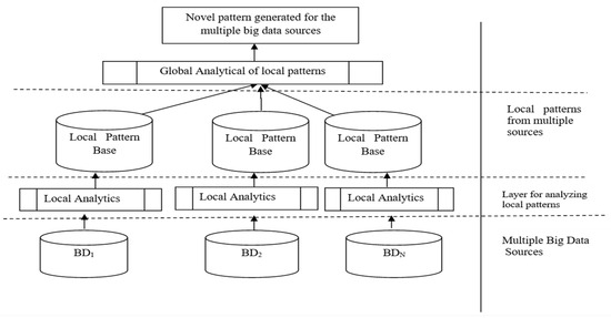 In recent years, there has been an increased focus on big data analytics for examining the multi-source data generated by inter-state business organizations. However, this field faces challenges that hinder both its theoretical and practical development [4,5,6]. Establishing a comprehensive big data framework for emerging applications still necessitates novel solutions [7]. The authors in [8] highlight the complexities inherent in big data analytics, describing it as involving diverse independent sources with distributed and decentralized control for composite and evolving representations. Consequently, applying a centralized computing approach (data warehouse-oriented) to the distributed and disparate nature of big data sources is not a feasible strategy for multi-state big data organizations. Furthermore, recent advancements in distributed technologies, open-source software initiatives, and the use of commodity hardware (commercially available hardware systems at lower cost) have further enhanced cost-effective solutions for implementing local pattern analytics. To reduce infrastructure costs, organizations are increasingly turning to commodity hardware and open-source software platforms and tools to meet their complex computational needs [9]. The Hadoop distributed processing framework, which includes HDFS (Hadoop Distributed File Systems) along with the Map-Reduce programming model [10], and the Spark distributed processing engine with in-memory based RDD (Resilient Distributed Dataset), are among the pioneering computational architectures for big data processing [11]. The Hadoop software Version 3.4 framework includes ecosystem software tools such as Hive (for SQL operations), Pig (for data pre-processing activities), Sqoop (for importing data from relational models), and Mahout (for implementing machine learning methods) to process big data sources without compromising the autonomy of data sources [12]. The Spark software Version 3.5 framework facilitates various ecosystem components, including Spark SQL for handling structured data, Spark-Streaming for processing stream data, and ‘MLib’ for implementing machine learning functionalities in a distributed manner.