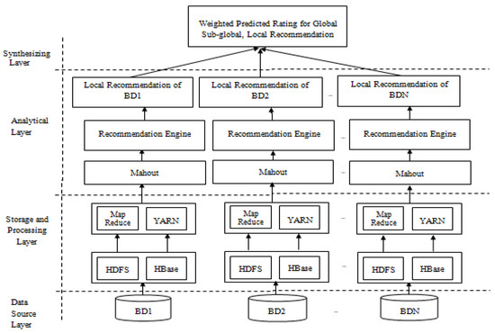 The schematic representation of the proposed weighting model is depicted in Figure 2. A layered approach is employed to illustrate the functionalities of the participating components. The data source layer encompasses the data sources of an inter-state business organization, comprising ‘N’ data sources, denoted as ‘BD1’, ‘BD2’, …, ‘BDN’, which are utilized to store customer transactions across ‘N’ branches. To process these data, commodity hardware, which refers to commercially available hardware, is employed in the subsequent layer, known as the storage and processing layer. The utilization of commodity hardware significantly reduces the cost of computing infrastructure while maintaining reasonable processing power. Each computing node is equipped with a Hadoop-based open-source software framework. This framework stores data in the native file system, specifically the Hadoop Distributed File Systems (HDFS), and processes it using a programming model called ‘Map-Reduce’. Additionally, one of the components of the Hadoop ecosystem, HBase, a well-known NoSQL database, is employed to store and process data in a scalable manner. Database-oriented read/write requests are communicated with the YARN (Yet Another Resource Negotiator) software framework of Hadoop 2.0, which is utilized for effective job scheduling and management of service requests. The subsequent layer, referred to as the analytical layer, is responsible for performing item-based collaborative filtering using the machine learning library of Hadoop, known as Mahout. This library employs a recommendation engine to predict the ratings of items found in the individual branch data sources. These predicted ratings are then forwarded to the next layer, termed the synthesizing layer. At this layer, weighting parameters, including the turnover cost of each branch, effective voting threshold, and effective voting rate of items, are applied, and the forwarded recommendations are synthesized into global, sub-global, and local patterns based on their presence in the participating branches. The top layer, known as the pattern discovery layer, is utilized to segregate and analyze the recommended patterns by the strategic management for further decision making. The rationale behind the proposed framework is to leverage big data processing layers within a commodity hardware setup to minimize operational costs and to discover regional patterns of interest with in-depth attention.