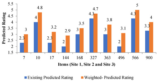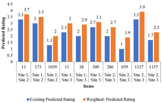 In this study, a comparative analysis is conducted between the proposed approach and the traditional item-based collaborative filtering method to highlight the advantages of the proposed weighting model in calculating the predicted ratings of global, sub-global, and local items. Figure 3 illustrates the comparison of predicted ratings for the top 10 globally recommended items, which are endorsed by all participating sites, namely S1, S2, and S3. As these items are present across all participating sites, their predicted ratings are significantly influenced by the turnover-based weighting model, resulting in higher predicted ratings compared with the traditional approach. Figure 4 depicts the comparison of predicted ratings for items classified at the sub-global level. These sub-global recommendations do not appear in all participating sites but are endorsed by the majority. For instance, item 659 demonstrates that if all items are evaluated without assigned weights, the predicted rating of 1.9 would be absent, thereby failing to highlight the regional significance of such items in terms of their market potential to strategic management.