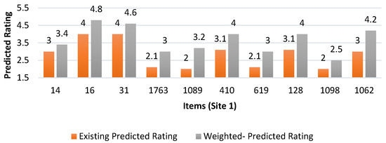 By employing the concept of data source weighting, the significance of regional patterns has been effectively captured, resulting in the proposed method achieving a superior predicted rating for all sub-global recommendations. Similarly, the effectiveness of the proposed weighted predicted rating method has been demonstrated for locally recommended items. These items are exclusively voted on within specific participatory data sources. Despite their infrequent occurrence, their implications are substantial for inter-state business organizations, particularly in terms of cost-benefit analysis. These local patterns are distinctive, with their marketability being high only on select platforms. Therefore, their predicted rating must be calculated by assigning an appropriate weight based on their participation relative to the turnover of the respective platform. The local recommended patterns, along with a comparison of predicted ratings in the participatory sites S1, are depicted in Figure 5.