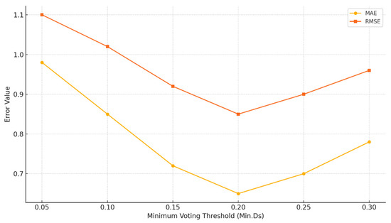 To systematically evaluate the heuristic introduction of two critical hyper parameters—namely the linear revenue-based weighting and the minimum voting threshold (Min.Ds)—a comprehensive sensitivity analysis was conducted. Initially, the minimum voting threshold (Min.Ds) was varied incrementally from 0.10 to 0.30 in steps of 0.05 to assess its impact on prediction performance. The findings, depicted in Figure 6, reveal that both MAE and RMSE attain their lowest values near the originally selected threshold of 0.20, thereby empirically validating the expert-derived choice.