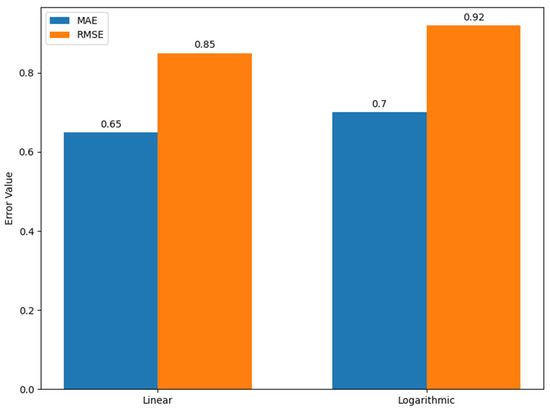 Impact of weighting function type (linear vs. logarithmic) on MAE and RMSE.