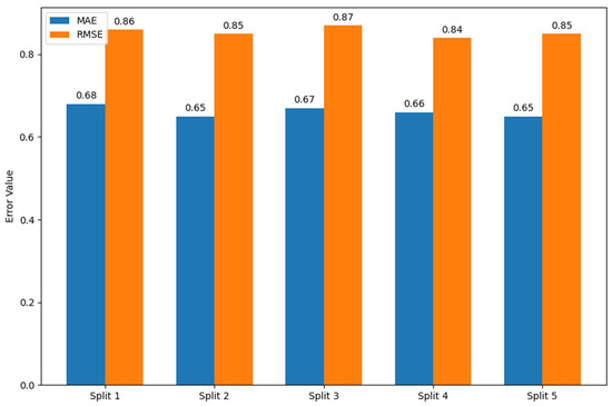 To ensure that the observed improvements are statistically robust and not merely a consequence of a single train/test split, five distinct random splits were generated and evaluated. Figure 8 illustrates the MAE and RMSE values across these splits, indicating that the performance of the proposed model remains consistent with minimal variation. This provides compelling evidence for the reliability and generalizability of the proposed weighting model.