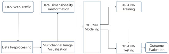 Dark web traffic consists of five aspects based on multi-channel image visual features and 3D convolutional neural networks, systematically achieving the intelligent recognition of dark web traffic, as shown in Figure 1.