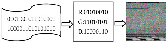 For example, 74D918 = (R: 116, G: 217, B: 24). After converting the code file into a one-dimensional pixel sequence, the pixel sequence is squared according to the above method to obtain a color image. Figure 2 shows the process of converting an executable file into an RGB image, including the executable file data of a certain malware, the pixel sequence obtained by re-encoding the executable file according to bytes, and the color image obtained after squaring the pixel sequence.