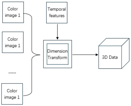 We select the header data of the flow; each header data is encoded as a two-dimensional vector. If each byte of the input data is treated as a pixel value, the output of this step is a two-dimensional grayscale image, which can be analyzed by image-processing methods. This paper adds time features, combining each two-dimensional vector into a three-dimensional vector as input, allowing the model to learn the characteristics of each three-dimensional data, as shown in Figure 3. By extracting the time dimension separately, the data at the same position of each image is similar, which is beneficial for CNN convolution kernels to extract features. This is equivalent to when processing videos: for each video segment, the control group flattens and combines each frame into one large image to learn the characteristics of each large image. This step does not exist in 1D-CNN and 2D-CNN.