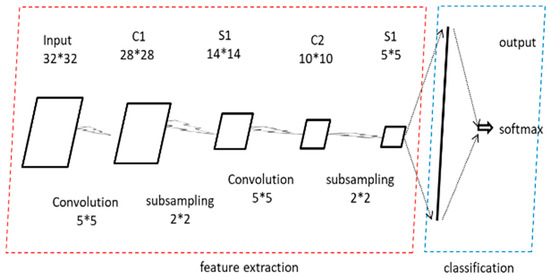 The input data size is 32*32. After passing through the first convolutional layer with a kernel size of 5*5, it becomes 28*28. Then, after passing through a 2*2 pooling layer, it becomes 14*14, completing the first convolution and pooling operation. Similarly, after passing through the second convolutional layer with a kernel size of 5*5, it becomes 10*10. After passing through a 2*2 pooling layer, it becomes 5*5. Finally, it is flattened through a fully connected layer into a one-dimensional vector, and classified through a SoftMax layer. This is an illustration based on an existing network structure, which can be modified according to actual needs.