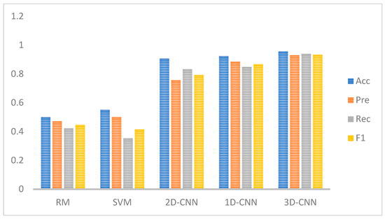 Table 3 presents more detailed values of Acc, Pre, Rec and F1 for the aforementioned five algorithms, and compares them based on the dimensionality of each algorithm’s data. Among them, since RM and SVM are not convolutional neural networks, they do not involve dimensionality.