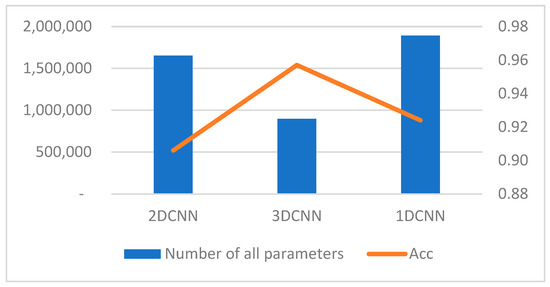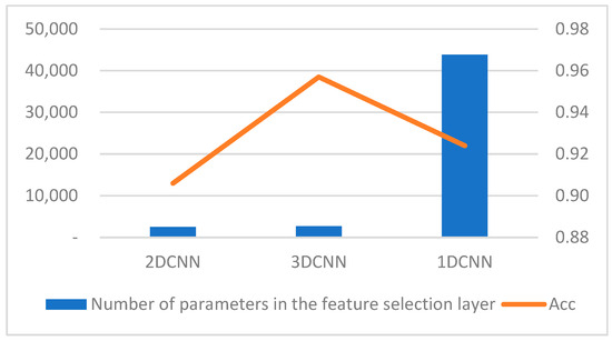 Regarding the number of feature selection parameters, the 3D-CNN network adopted in this paper has slightly increased feature selection parameters due to its larger neurons and convolution kernels. However, its classification performance is indeed better than that of the 2D-CNN network without extracting temporal features. In comparison with 1D-CNN, 3D-CNN performs better in both accuracy and the number of feature selection parameters, as shown in Figure 12.