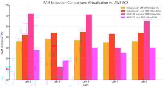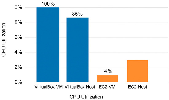VirtualBox is a type-2 hypervisor, which means it depends on the hardware of the host machine to allocate resources. This reliance can cause performance problems, especially if the host is busy with other tasks or does not have enough resources available [35]. On the other hand, AWS EC2 operates in the cloud and draws from a large pool of virtual CPUs (vCPUs) that are specifically optimized for cloud workloads. This setup allows EC2 instances to run efficiently, even when faced with heavy computational demands, because they function in isolated environments that are less impacted by the limitations of the host machine [25,36]. AWS EC2 also provides dynamic resource allocation based on real-time demand, which is critical in education, as computing requirements change with course progression and enrollment size [37]. While this study assigned one vCPU per virtual machine in both situations to ensure equal resource provisioning, it is important to emphasize that hardware equivalence is not implied. AWS EC2 instances use server-grade hardware, while VirtualBox runs on a consumer-grade Intel Core i5 laptop. Performance measures should not be limited to infrastructure design or virtualization software. Furthermore, while both environments were assigned 2 GB of RAM per VM, the underlying memory architecture differed significantly. AWS EC2 employs high-speed, server-grade memory with enhanced caching, whereas VirtualBox relies on regular laptop memory. These changes have a direct impact on RAM efficiency and should be considered when interpreting performance results [38].