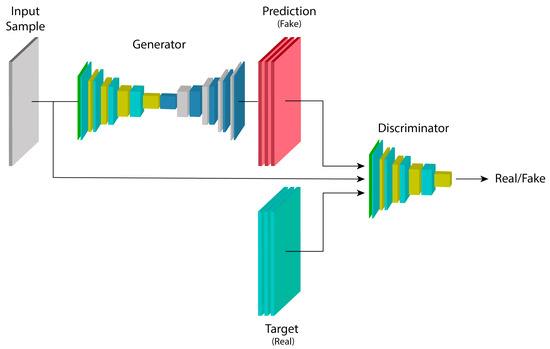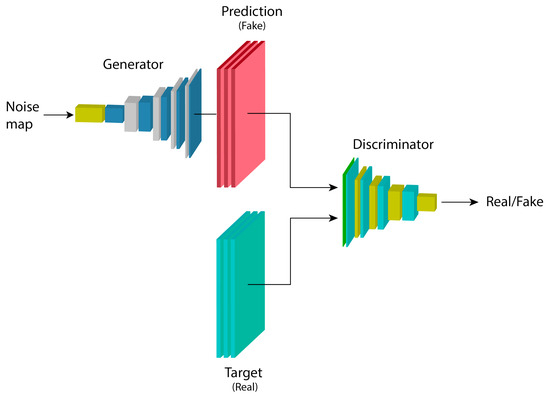 GANs are architectures composed of two models: a generator G and a discriminator D, with parameters and , respectively. G learns a mapping from a random noise vector z to an output map (image) x, represented by , while the task of D is to distinguish between examples from the dataset and examples generated by G, denoted as [35].