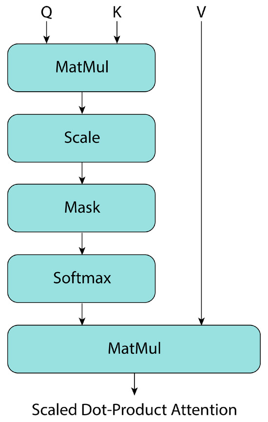 Attention is described in [37] as a mapping of a query Q and a set of keys K and values to an output V, where the queries, keys, and values are all vectors. The attention block, known as “Scaled Dot-Product Attention” (Figure 7), consists of queries and keys with dimension , and values with dimension . Then, using the softmax activation function, attention is calculated as follows: