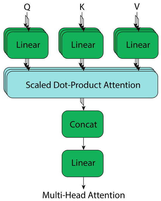 From this, multi-head attention blocks are a generalization of “Scaled Dot-Product Attention” (Figure 8), where multiple attention blocks are stacked, and their outputs are concatenated. This allows the architecture to process multiple input vectors in parallel, providing more context information at each propagation step of the feature maps. The mathematical representation of these blocks is as follows, where W denotes the model weights [37]:
