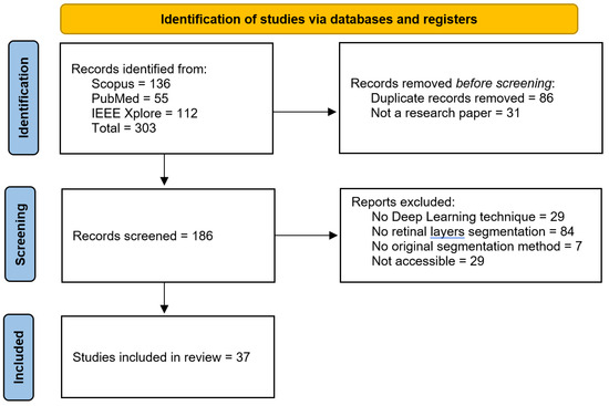 A total of 303 articles were identified, of which 86 were duplicates and 31 were not original research articles (e.g., databases or reviews). From the remaining 186 articles, 119 were excluded based on three filters. The first filter required the use of deep learning-based image processing techniques. The second filter focused on the area of interest for segmentation or detection; many articles referenced the retinal layers but aimed to identify fluid or abnormalities rather than the retinal layers themselves. The third filter involved a full-text review to ensure that the proposed segmentation method was both original and developed by the authors. After applying these filters, 66 articles were selected from which 37 articles were accessible by the authors and included in this review (Figure 9).