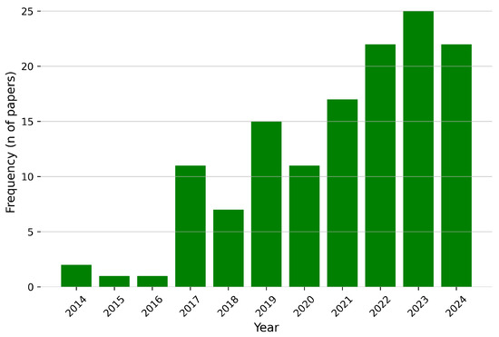 The articles retrieved using the specified keywords from Scopus, PubMed, and IEEE Xplore span from 2014 to October 2024, the date on which the search was conducted, as shown in Figure 10.