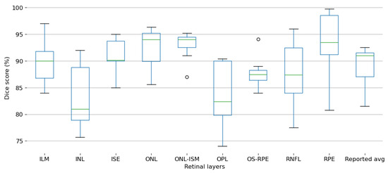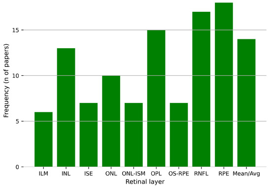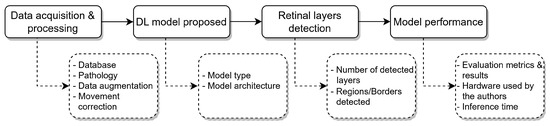 The information extracted from the included articles was divided into four main categories: data acquisition and processing, segmentation method, detected retinal layers, and model performance, as shown in Figure 11 and reviewed in the following sections of this review.