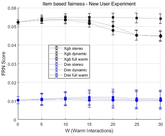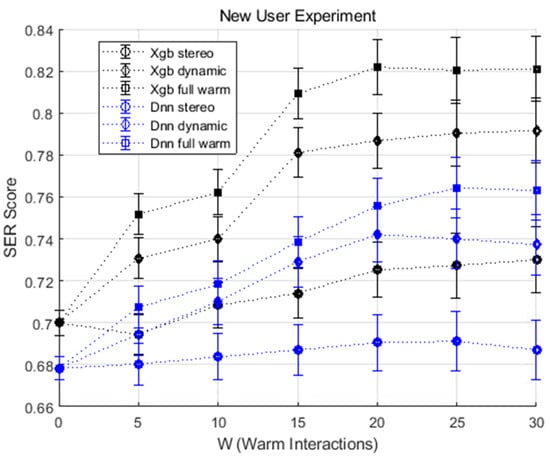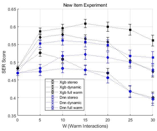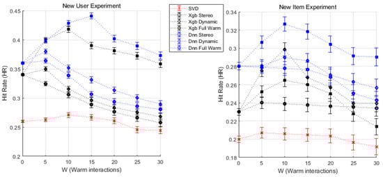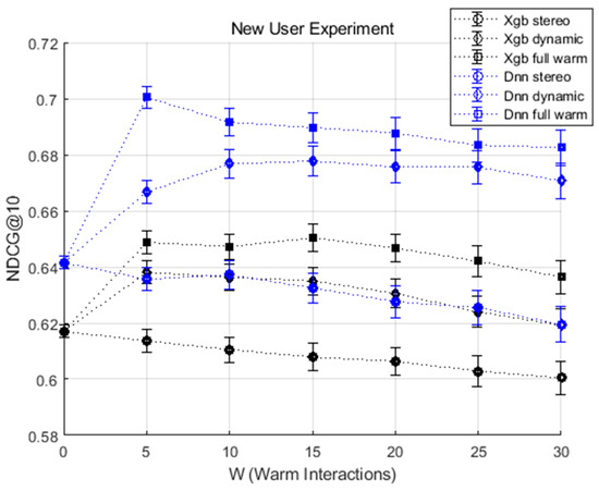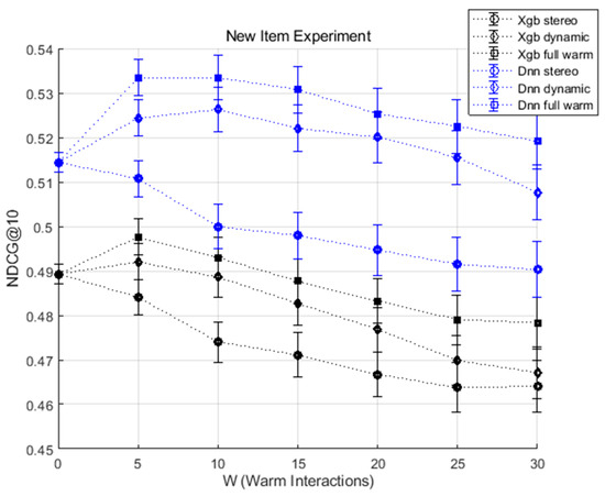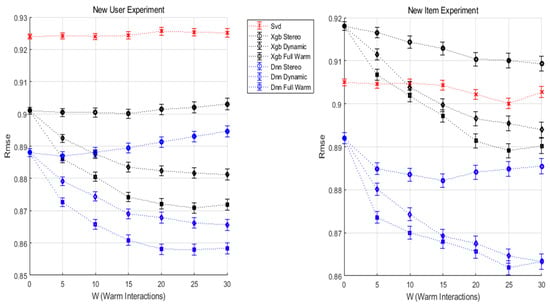 The accuracy of single recommendations is customarily measured via the root mean squared error (RMSE) [16,36]. Figure 1 displays the accuracy of the predicted ratings in the new-user and new-item experiments as a function of the number of warm-up reviews. The figure also illustrates the confidence intervals of the estimated values at a p-value of 0.05 (95% confidence). The baselines for pure cold start (Svd, Xgb stereo, and Dnn stereo) do not exhibit marked improvement or degradation in their RMSE as W increases for the new-user case (the case mostly studied in the literature). Only Dnn stereo has minimal degradation as increases; nonetheless, it remains the best-performing pure-cold-start baseline algorithm under this metric. All pure-cold-start baselines tend to slowly degrade with W because once the recommendations for the dominant stereotypes have been made, improving on the most popular items of the given user stereotype without personalization effects is more difficult if not impossible.