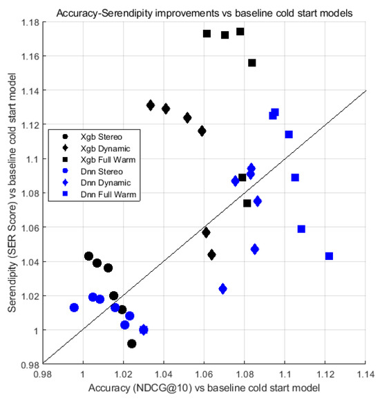- The pure-cold-start RS with a DNN is discussed in [4] in its standard form and stereotyped formulation—Dnn, Dnn stereo.